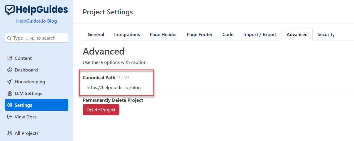 Your canonical path is configured by the HelpGuides team. Once configured you can find it on the Advanced Tab in settings: